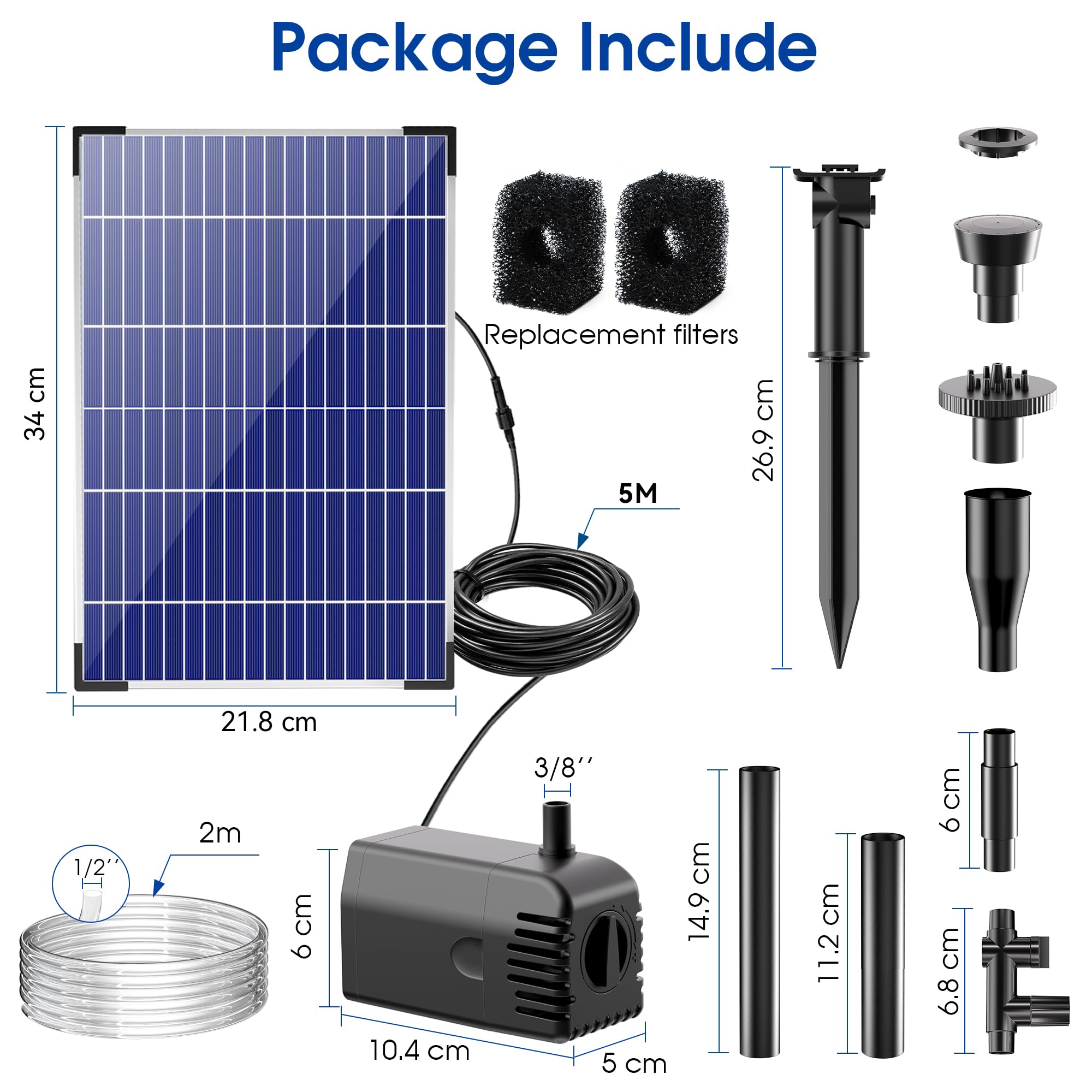 Multiple Filtration and Anti-Dry run Operation Protection: Solar Fountain pump equipped anti-dry operation plugs and 2 filter replacements which use a two-way filtration and Built-in filter cotton, effectively prevent debris blocking the pump body for long use.