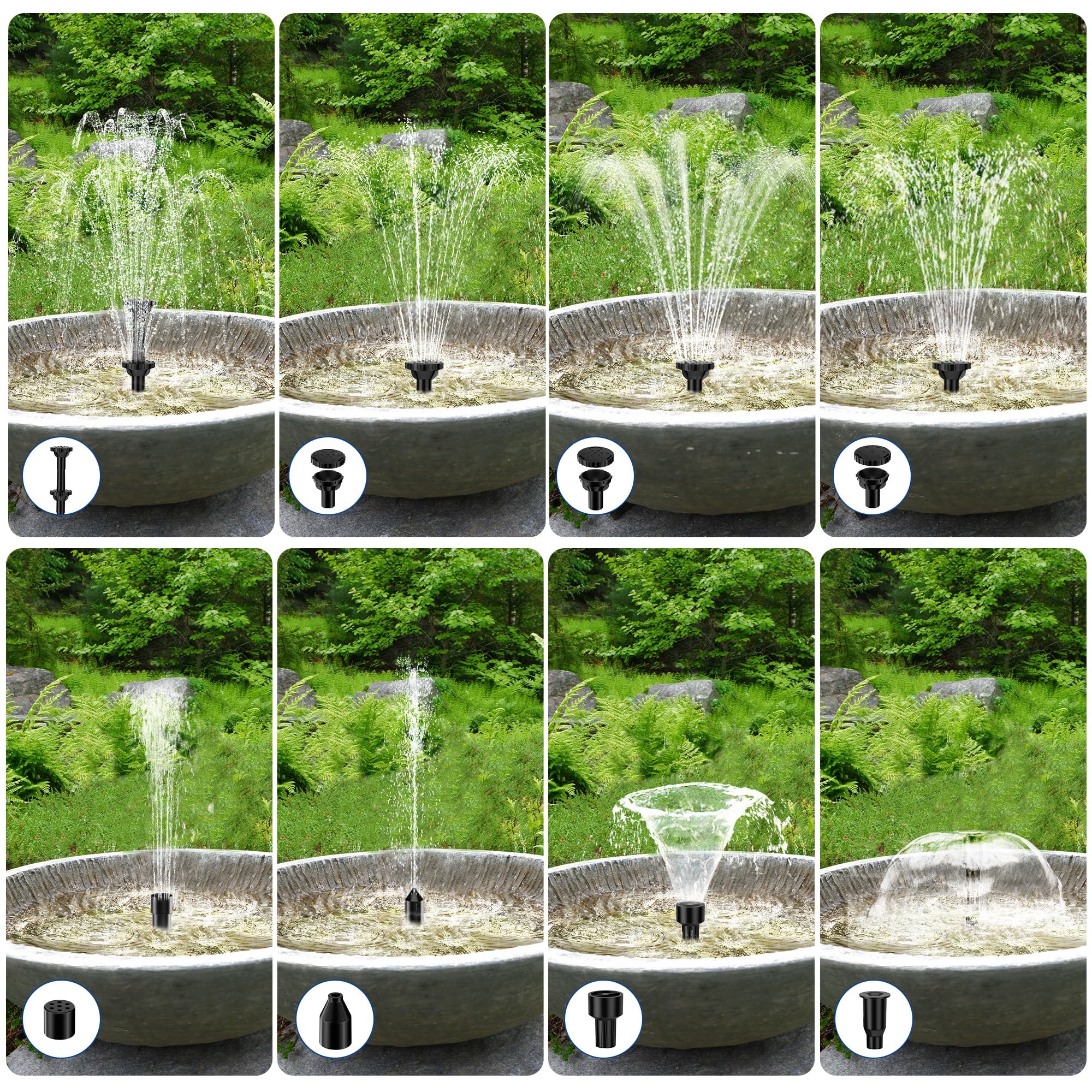 POWERED BY SUNLIGHT ENERGY: Nothing is more reassuring when you know that you're using a garden fountain pump without running cost for electricity. It means you have a lot less hassle, and it's also safe and has less impact on the environment. These solar fountain pumps can be used almost anywhere at home (birdbath, garden, pond, yard and water project), as long as there is enough sun.