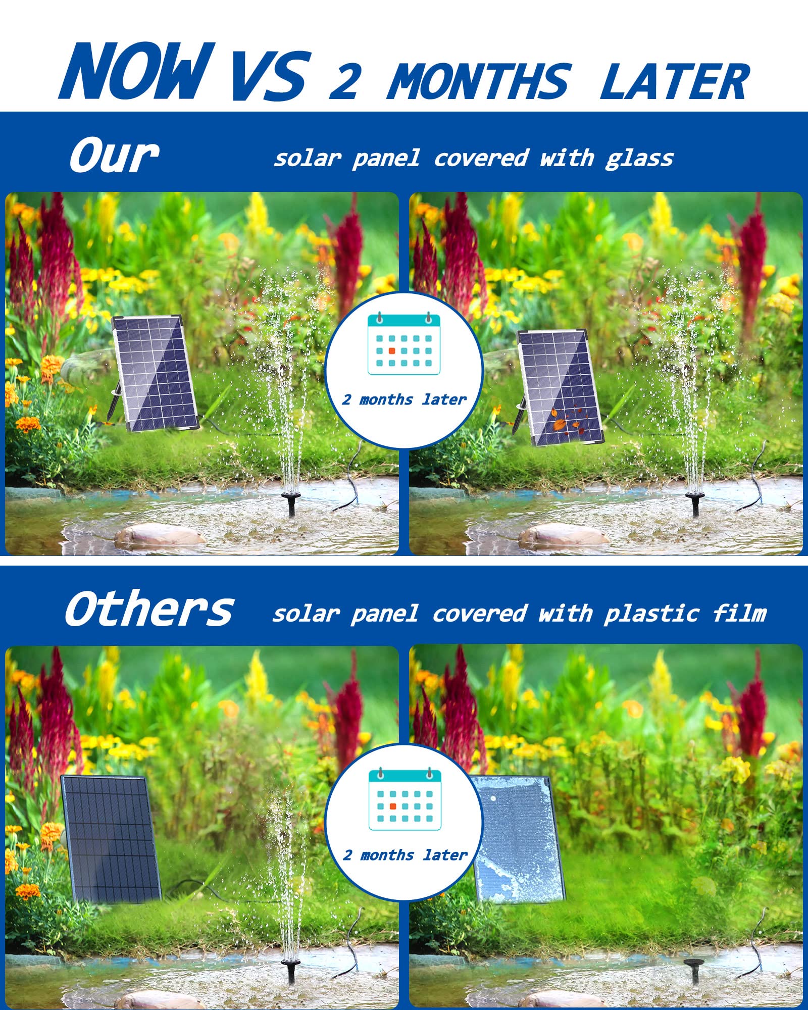 MORE POWERFUL SOLAR FOUNTAIN KIT: Our solar panels are covered with glass, which can protect the solar wafers well and does not affect the conversion efficiency of solar energy. These solar panels have a power of 7.5W and output a voltage of 10V to make the pump work more stable and powerful.