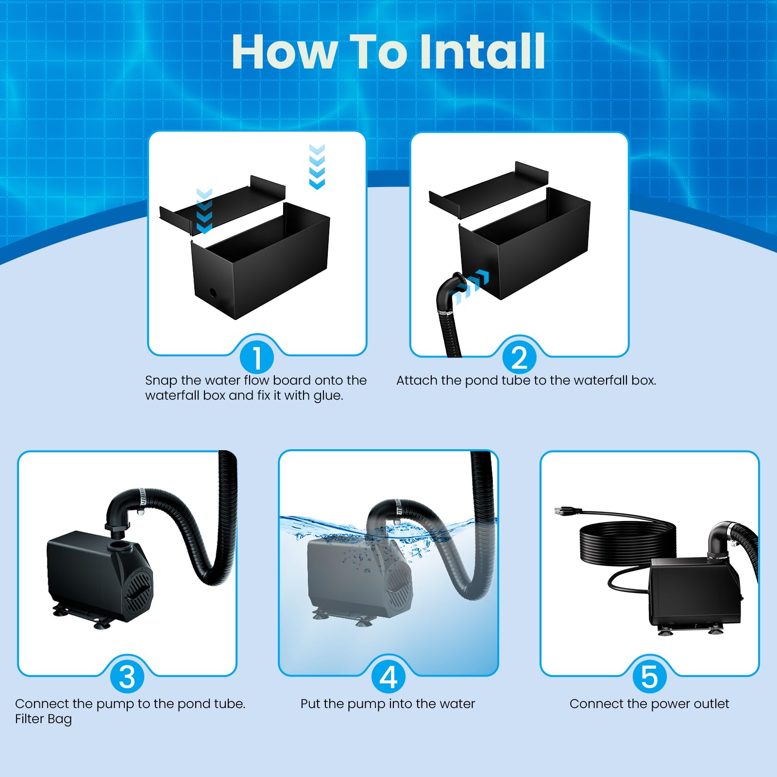 Durable 304 stainless steel pond waterfall spillway with 660GPH pump, rust-proof design, easy installation, and filter bag for gardens, ponds, fountains, and outdoor water features.