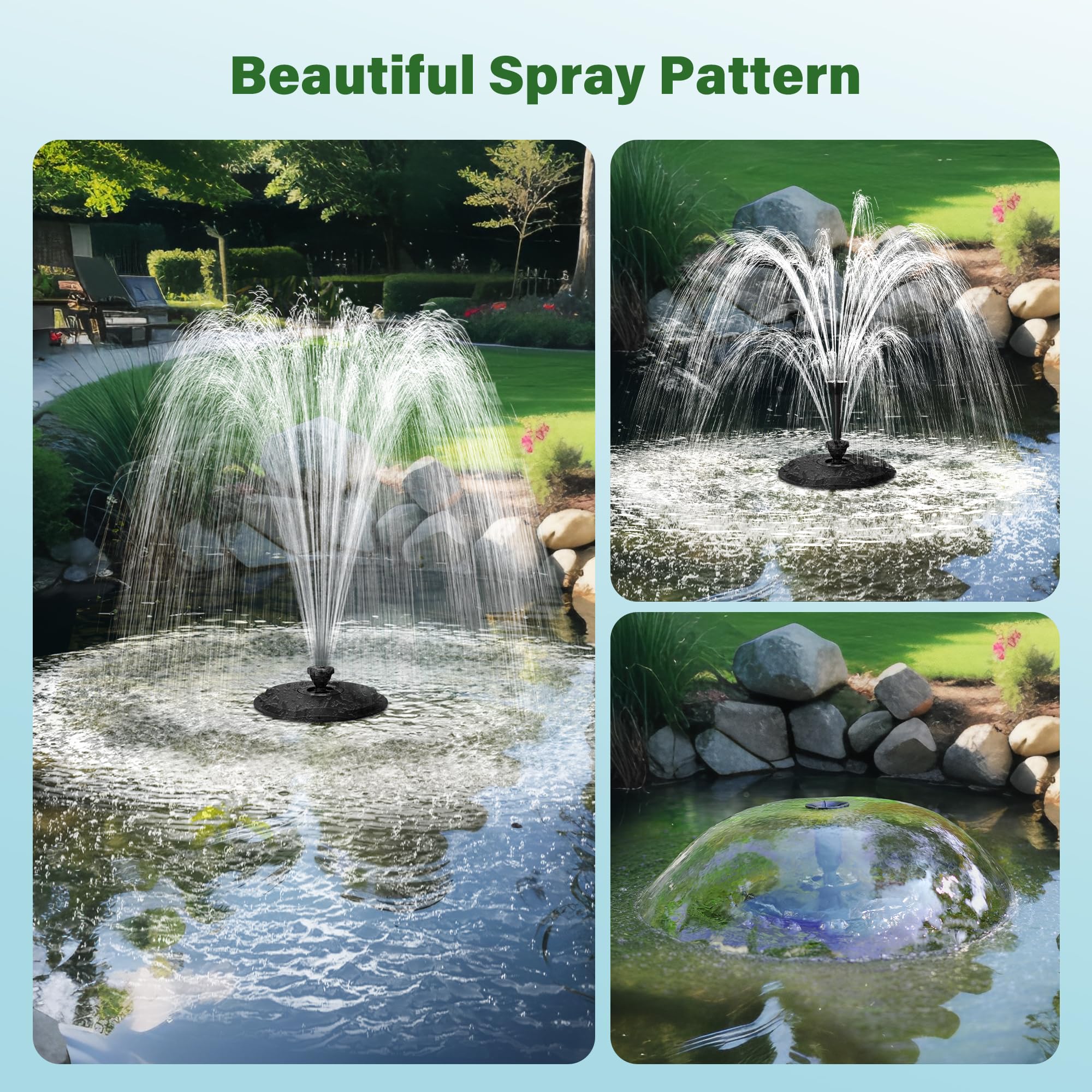 Floating Fountain for Large Pond: Suitable for ponds, swimming pools and landscape fountains. Through 360° oxygenation spray, it can improve water quality and increase the oxygen content in the water