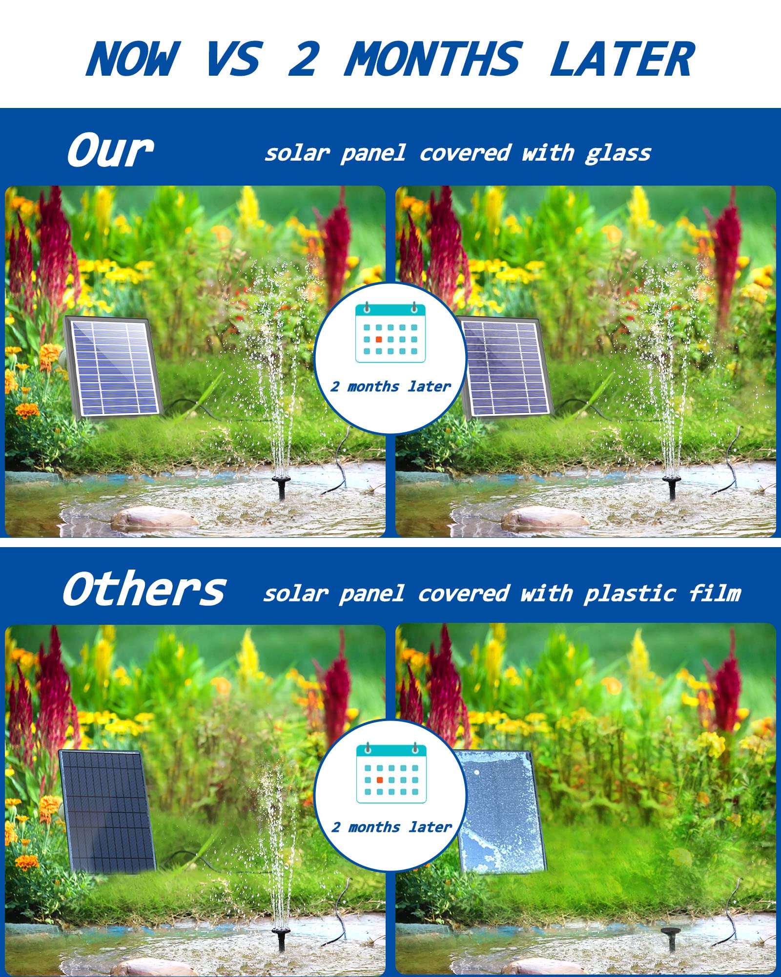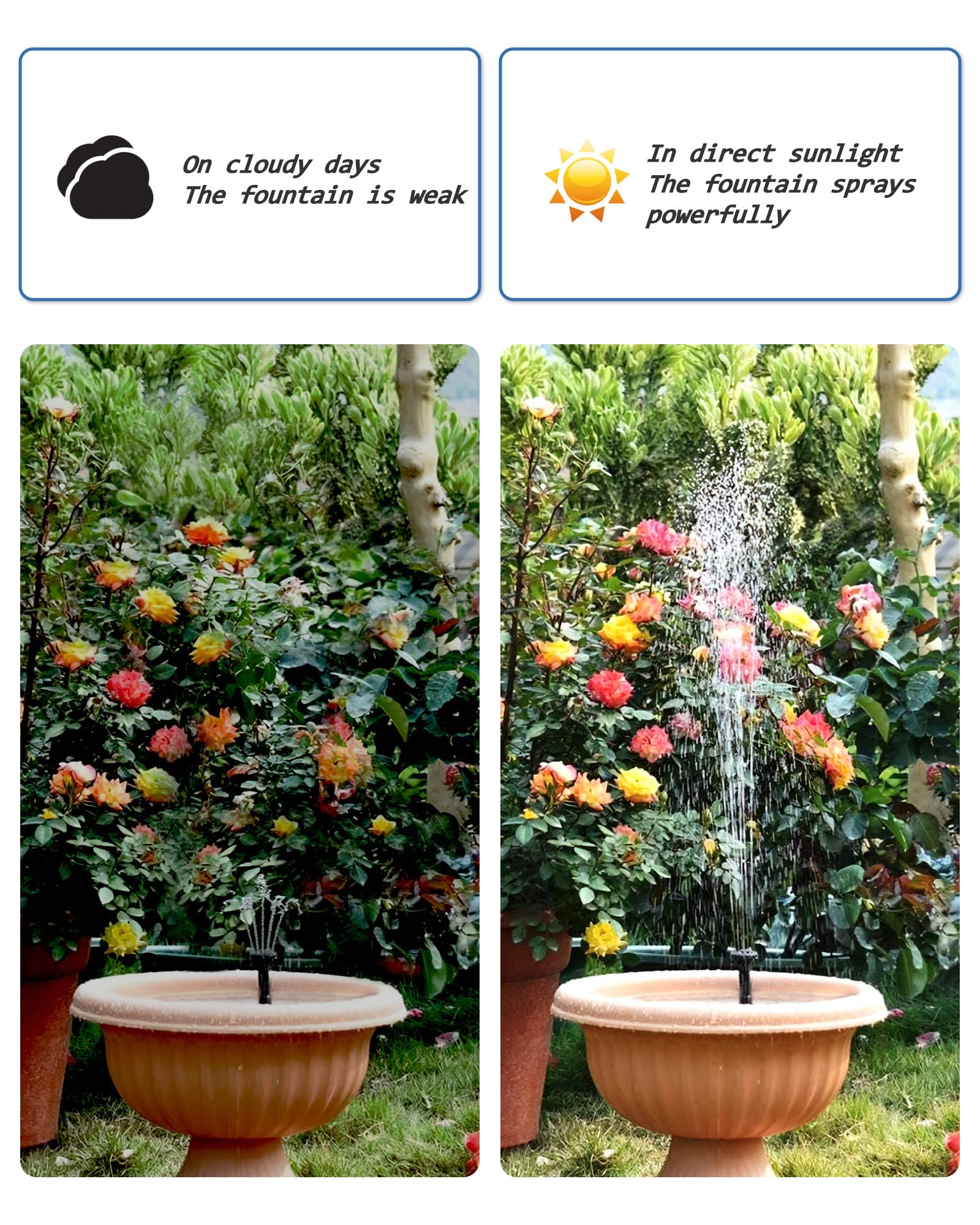 The solar fountain pump will help keep the bird baths fresh and birds happy, attract many birds to your garden, providing them with a cold drink or a quick soak.